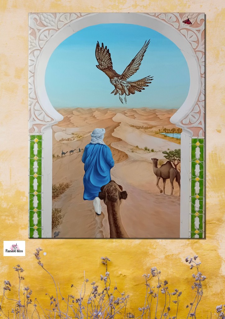 Cette toile tout juste sortie de l’atelier, nommée « Inspiration Maroc » parle du désert marocain, de la relation entre l’homme les dromadaires, l’homme et le faucon…ravira et enchantera votre intérieur.