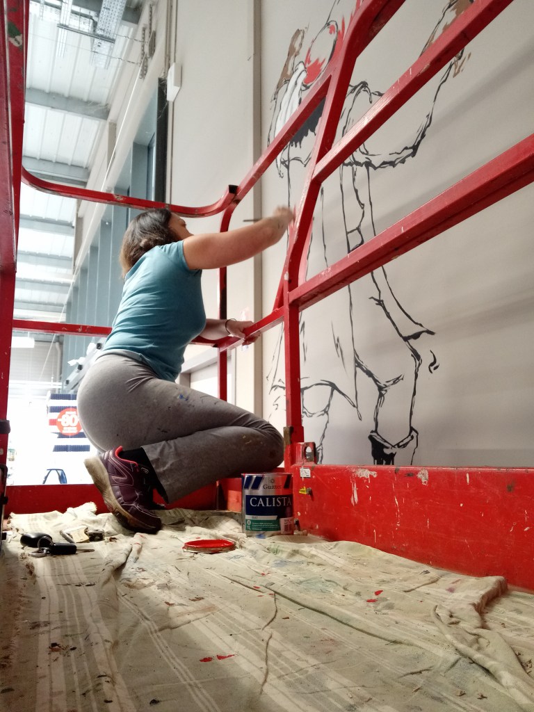 J’ai choisi un style esquissé pour capter le mouvement et donner vie à cette grande surface murale.